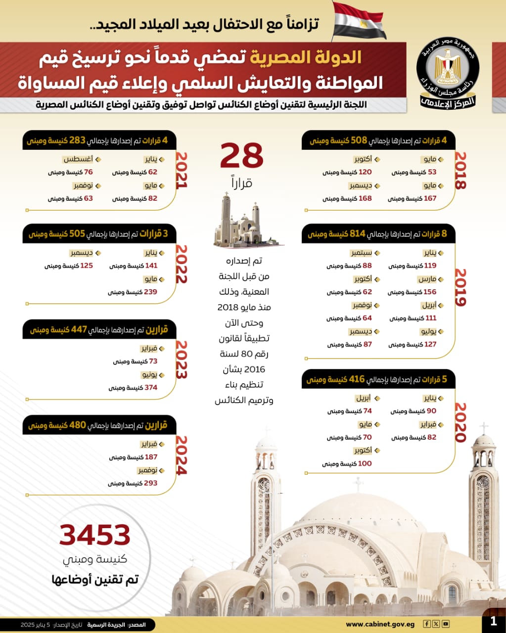 نشر المركز الإعلامي لمجلس الوزراء، تقريرًا تضمن إنفوجرافات تسلط الضوء على جهود الدولة المصرية نحو ترسيخ قيم المواطنة والتعايش السلمي وإعلاء قيم المساواة وذلك تزامنًا مع الاحتفال بعيد الميلاد المجيد.