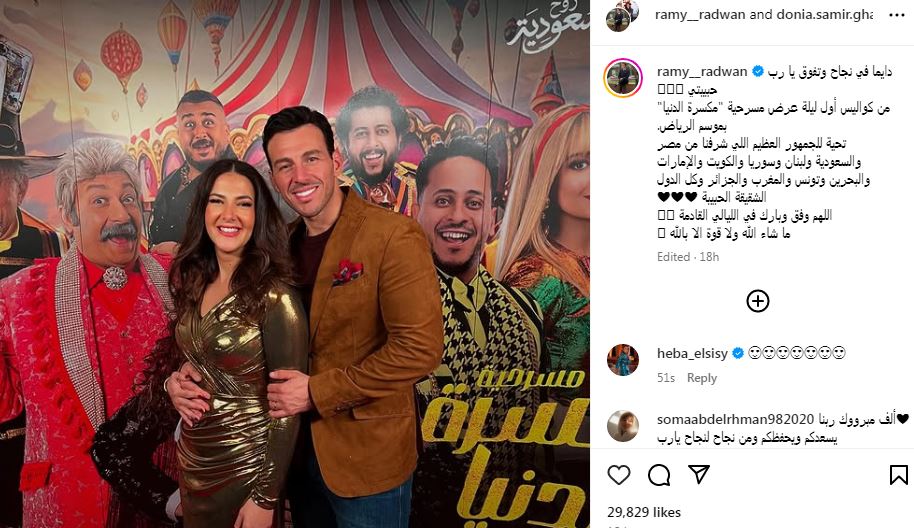 ونشر رامي صورة تجمعه بزوجته دنيا سمير غانم وعلق عليها "دايما في نجاح وتفوق يا رب حبيبتي من كواليس أول ليلة عرض مسرحية "مكسرة الدنيا" بموسم الرياض".