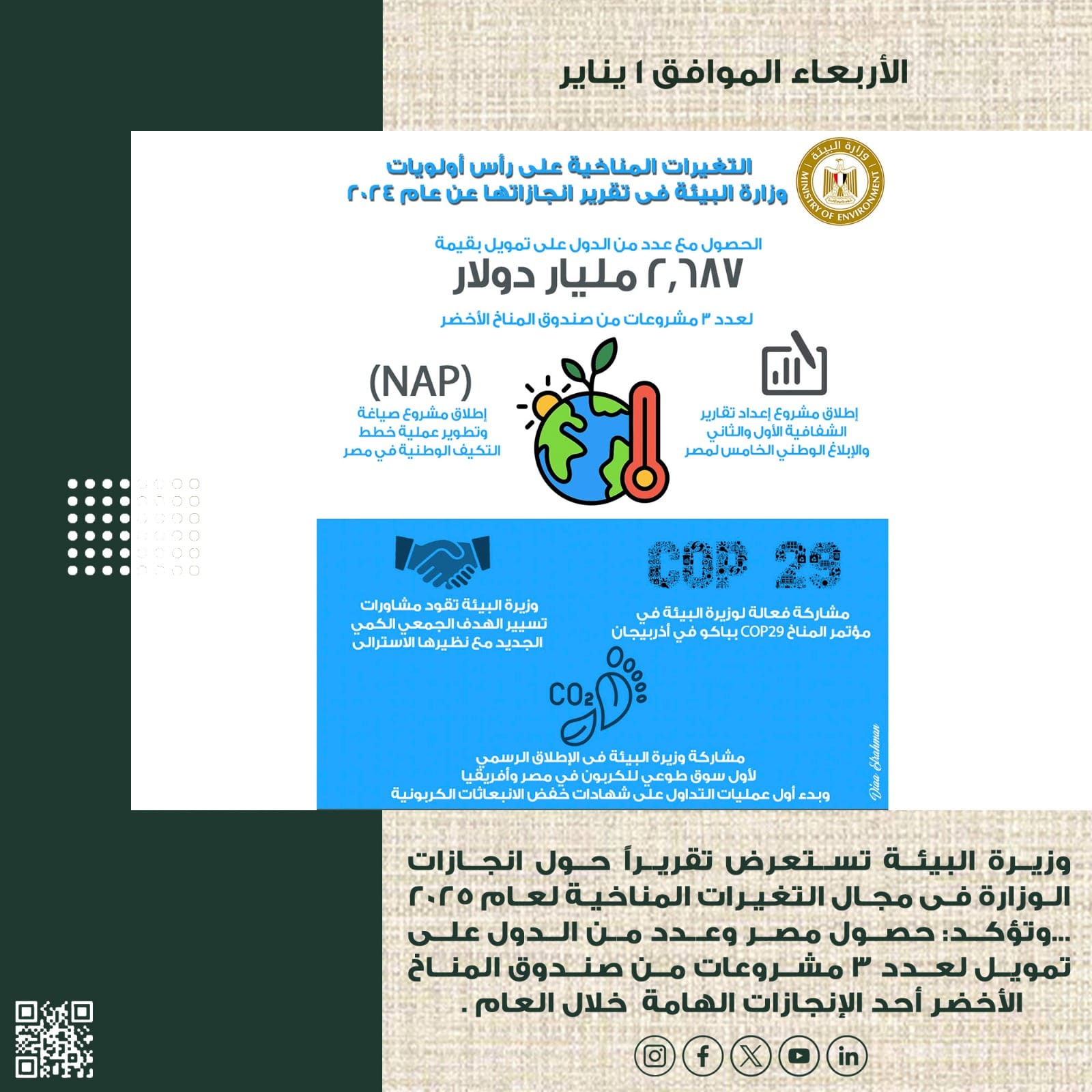 - أكدت الدكتورة ياسمين فؤاد وزيرة البيئة على الجهود الكبيرة التى بذلتها الوزارة للتصدى للتغيرات المناخية على المستويين الوطنى والدولى خلال عام ٢٠٢٤ ، والتى يعد أهمها ، حصول مصر وعدد من الدول على تمويل لعدد 3 مشروعات من صندوق المناخ الأخضر حول مشروعات "تخضير الأنظمة المالية وصندوق استثمار الزراعة المرنة الذكية ومرفق توسيع البنية التحتية المرنة للمياه" كأحد ثمار جهود وزارة البيئة في خلق مناخ داعم لتمويل المناخ من خلال شركاء التنمية والقطاع الخاص بحزمة تمويلية تقدر 2.687 مليار دولار أمريكي،جاء ذلك خلال التقرير الذى استعرضته وزيرة البيئة عن انجازات الوزارة خلال عام ٢٠٢٤.