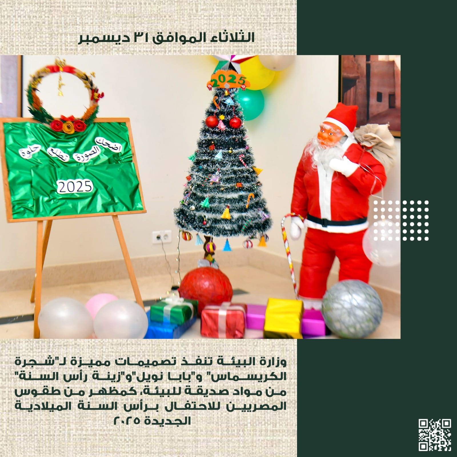 تحتفل وزارة البيئة بأعياد الميلاد هذا العام ٢٠٢٥ على طريقتها الخاصة، حيث نفذ فريق التوعية بالإدارة المركزية للإعلام والتوعية البيئية بالوزارة، تصميمات مميزة لـ"شجرة الكريسماس" و"بابا نويل"و"زينة رأس السنة" من مواد صديقة للبيئة، كمظهر من طقوس المصريين للاحتفال برأس السنة الميلادية الجديدة ٢٠٢٥، وذلك من أجل إرساء أفكار إعادة استخدام وتدوير مخلفات البيئة والاستفادة منها على أكمل وجه.مظاهر الاحتفالات التي قدمها فريق التوعية بالوزارة لـ"شجرة الكريسماس" و"بابا نويل"، بوكيه ورد، وكور من الخيوط الملونة ، بمناسبة أعياد رأس السنة جاءت من مكونات صديقة للبيئة من المخلفات المنزلية من قماش، خيط، وكرتون، ورق الفوم اللامع، ومخلفات خشب، وخيش وذلك لتحقيق منظر جمالي، حيث يمكن صناعته فى المنزل ببعض الأدوات البسيطة واعادة استخدام الأشياء القديمة لتزيين المنزل بأقل التكاليف وإدخال البهجة والسعادة فى المكان.