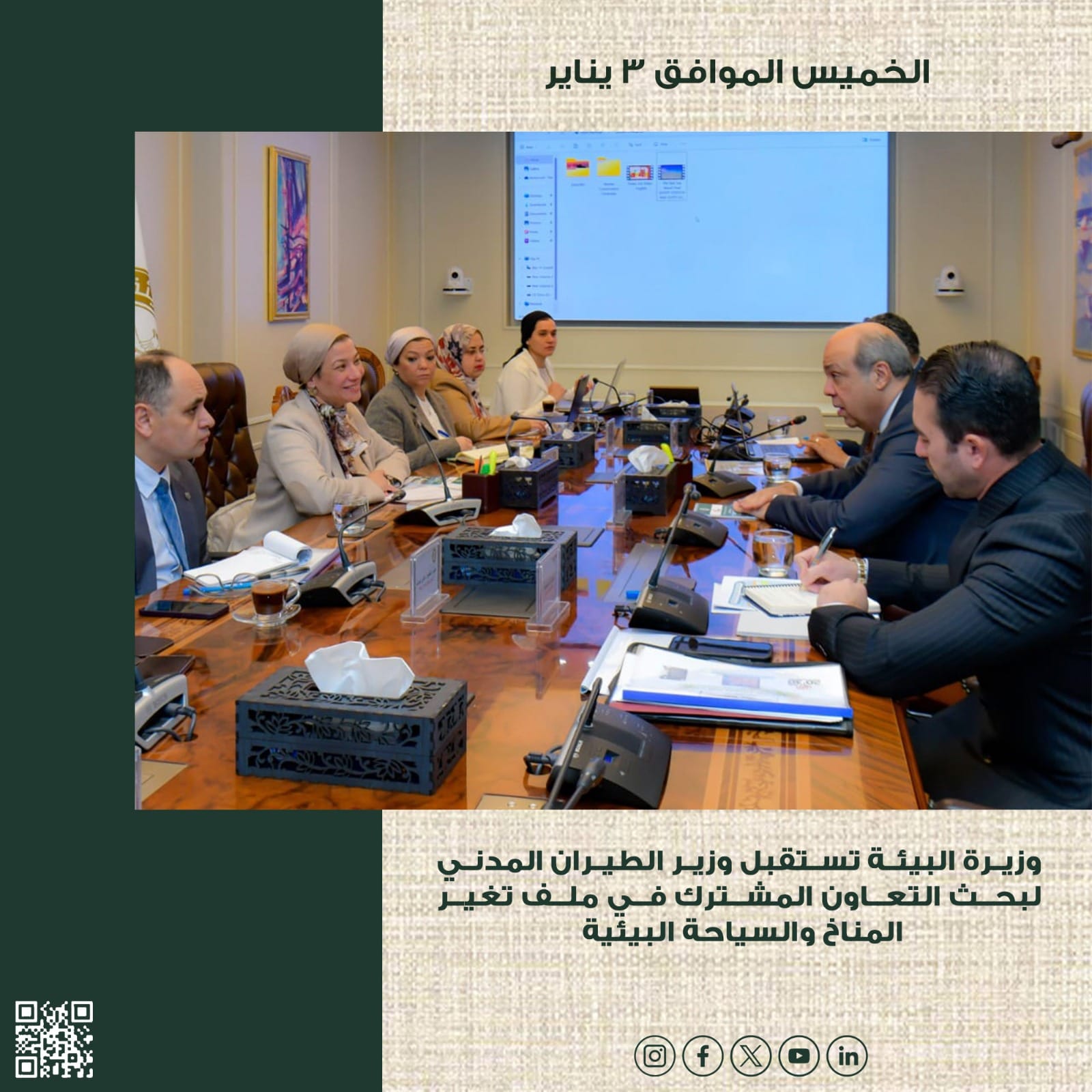 - استقبلت الدكتورة ياسمين فؤاد وزيرة البيئة الدكتور سامح الحفني وزير الطيران المدني لمناقشة التعاون المشترك في ملف مواجهة آثار تغير المناخ واستخدام وقود الطيران المستدام SAF والترويج للسياحة البيئية ، وقد أكدت الدكتورة ياسمين فؤاد خلال اللقاء على أهمية العمل المشترك وإضفاء مزيد من مجالات التعاون بين الوزارتين لدعم العمل البيئى، ومنها التعاون للترويج للسياحة في مصر وخاصة السياحة البيئية والمحميات الطبيعية، حيث عرضت بعض الأفلام التي أنتجتها وزارة البيئة للترويج للسياحة البيئية ومنها فيديو حملة حكاوي من ناسها والحفاظ على البيئة البحرية وفيديو ترويجى لجزر محميات البحر الأحمر ، ليتم عرضها في المطارات ضمن خطة للترويج للسياحة البيئية في مصر، وايضاً التعاون في تعزيز استخدام منتجات القائمة الخضراء صديقة البيئة لدى وزارة الطيران المدني مثل استبدال الاكواب البلاستيكية بالورق، وأدوات الطعام البلاستيكية بالخشب، باشراك القطاع الخاص الفندقي.