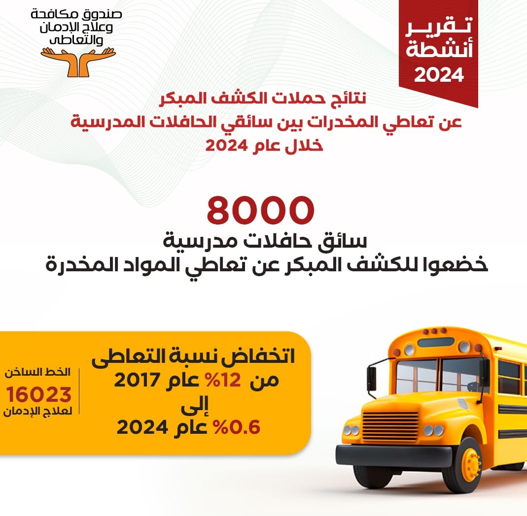 وكشف التقرير باستمرار تكثيف حملات الكشف المبكر عن تعاطي المواد المخدرة بين سائقي حافلات المدارس خلال فترة الدراسة عن طريق مجموعات عمل مشتركة من صندوق مكافحة وعلاج الإدمان والإدارة العامة للمرور والإدارة العامة لمكافحة المخدرات ووزارة التربية والتعليم، والأمانة العامة للصحة النفسية بوزارة الصحة، وذلك لإجراء التحاليل الطبية للسائقين داخل مقر المدارس .
