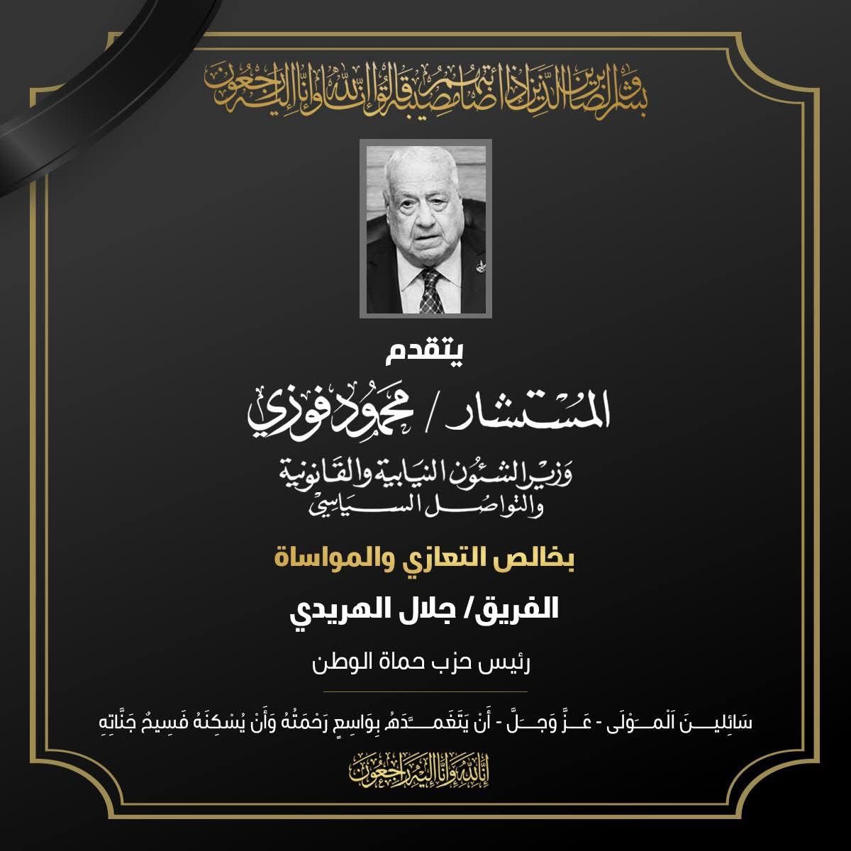وزير الشؤن النيابية ينعي الفريق جلال هريدي رئيس حزب حماه الوطن