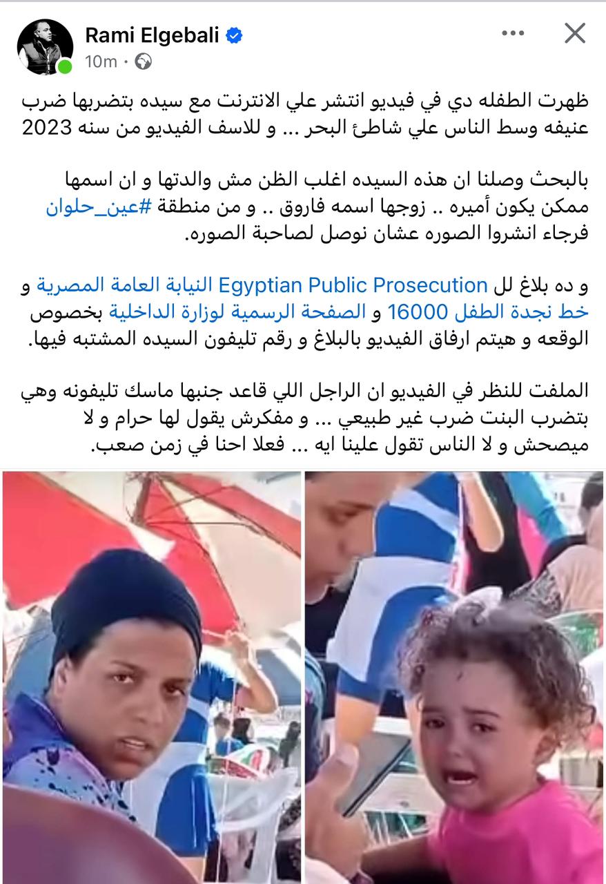 وبعد تصدر الفيديو قال المهندس رامي الجبالي مؤسس صفحة أطفال مفقودة عن الواقعة: "ظهرت الطفلة دي في فيديو انتشر علي الانترنت مع سيده بتضربها ضرب عنيفة وسط الناس علي شاطئ البحر ... و للاسف الفيديو من سنه 2023".