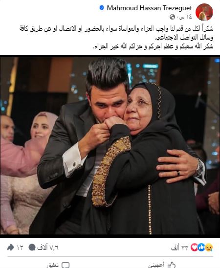 وكتب تريزيجية عبر صفحته الرسمية "فيس بوك" شكراً لكل من قدم لنا واجب العزاء والمواساة سواء بالحضور او الاتصال او عن طريق كافة وسائل التواصل الاجتماعي شكر الله سعيكم و عظم اجركم وجزاكم الله خير الجزاء".