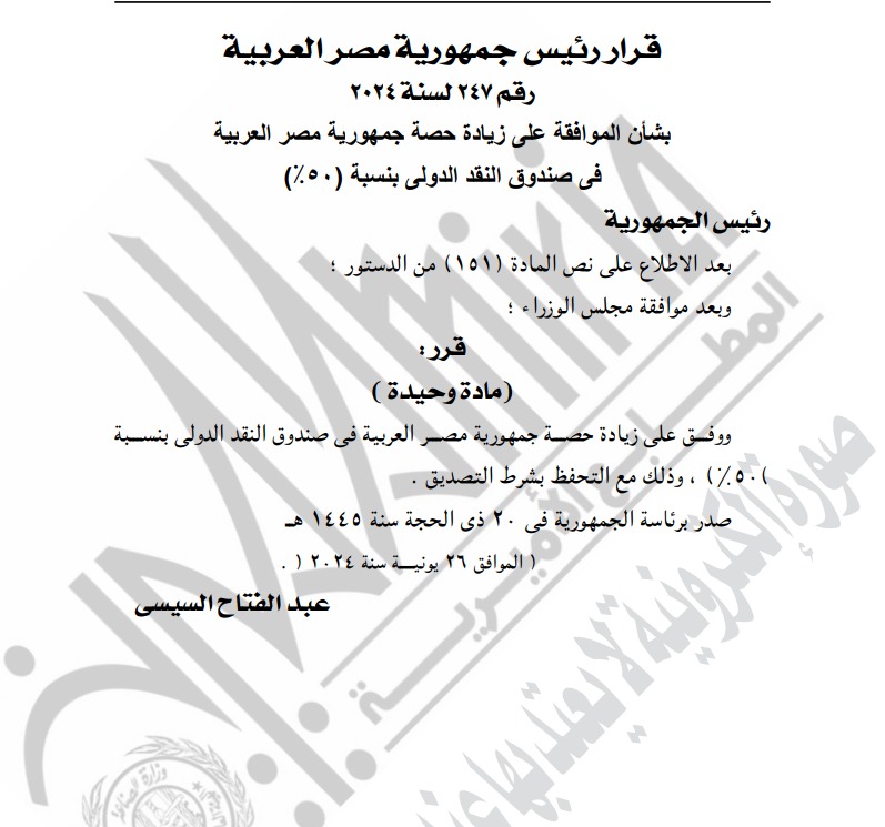 أصدر الرئيس عبد الفتاح السيسي، رئيس الجمهورية، قرارًا رقم 247 لسنة 2024، بشأن الموافقة على زيادة حصة جمهورية مصر العربية في صندوق النقد الدولي بنسبة 50%.