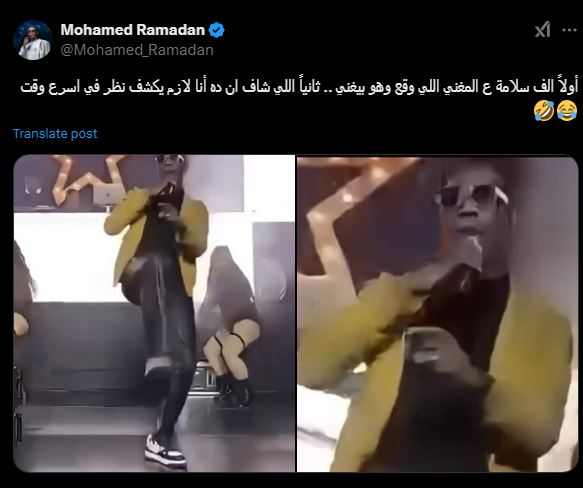 وكتب رمضان عبر صفحته الرسمية علي منصة "أكس" تويتر سابقآ " أولاً الف سلامة ع المغني اللي وقع وهو بيغني .. ثانياً اللي شاف ان ده أنا لازم يكشف نظر في اسرع وقت ".