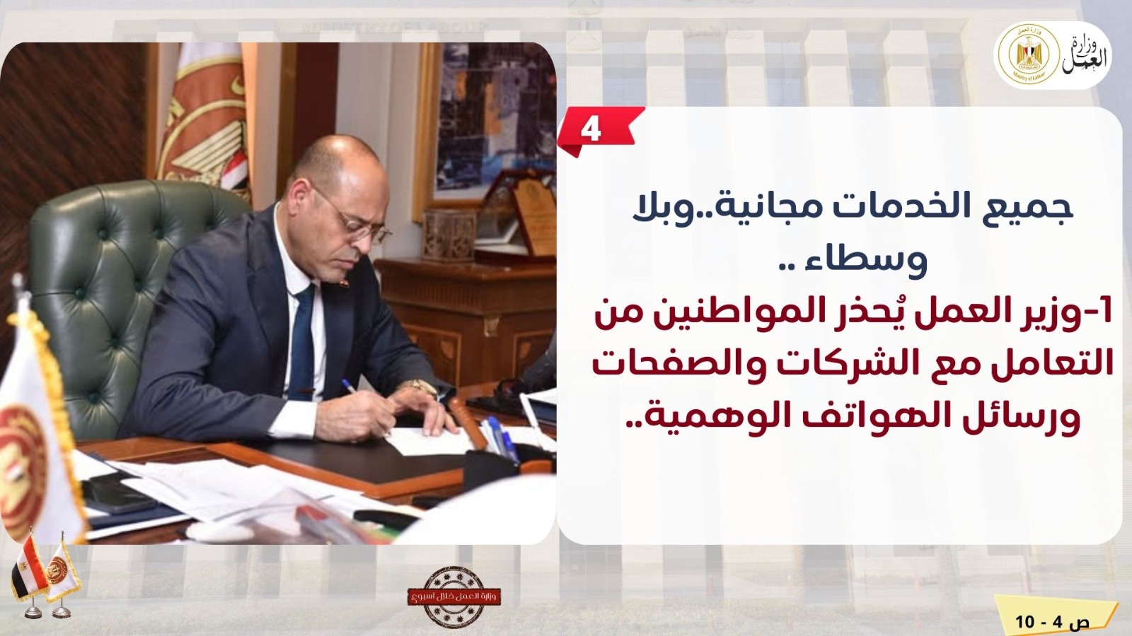 كما جدد وزير العمل، دعوته إلى المواطنين المصريين، بعدم الانسياق وراء الصفحات والمواقع الإلكترونية التي تنشر شائعات ومعلومات مغلوطة، وكذلك الشركات غير المرخصة، والرسائل الهاتفية الوهمية، التي تستمر في النصب على المواطنين، وتطلب منهم الأموال، مقابل تسهيل خدمات، كتوفير فرص عمل في الداخل أو الخارج، أو صرف منح للعمالة غير المنتظمة، وغيرها.
