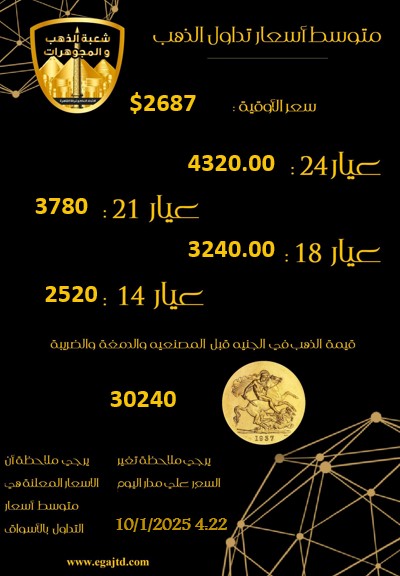 أما الجنيه الذهب، فقد سجل نحو 30240 جنيهًا للبيع و30000 جنيهًا للشراء، بينما وصلت أونصة الذهب إلى 2687 دولارًا للبيع و2674.06 دولارًا للشراء.