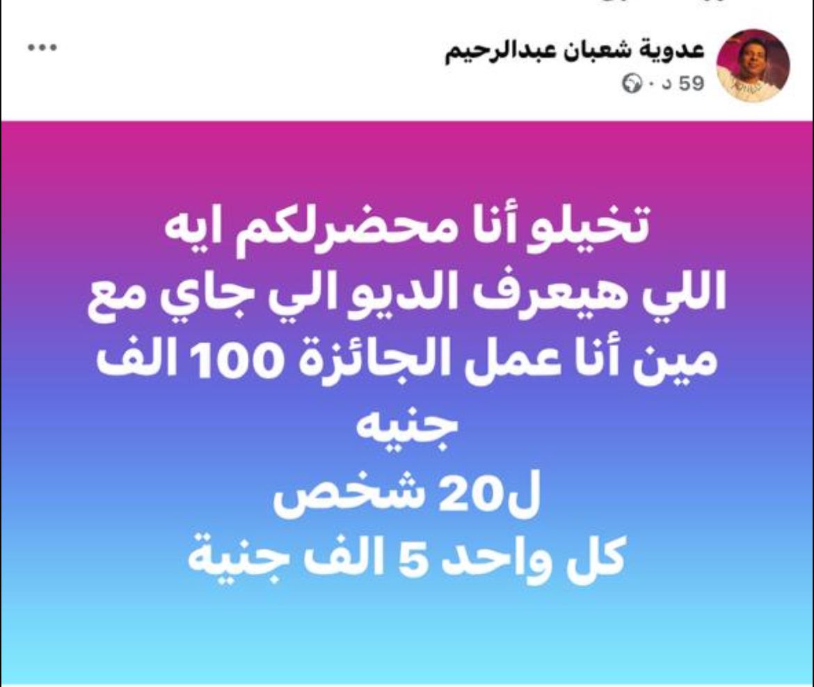 ونشر عدوية شعبان عبدالرحيم منشور عبر فيسبوك أعلن فيه تفاصيل المسابقة قائلاً: "تخيلوا أنا محضر لكم، اللي هيعرف الديو الغنائي اللي جاي مع مين أنا عامل جائزة 100 ألف جنية لـ 20 شخص كل واحد خمس ألاف جنيه".