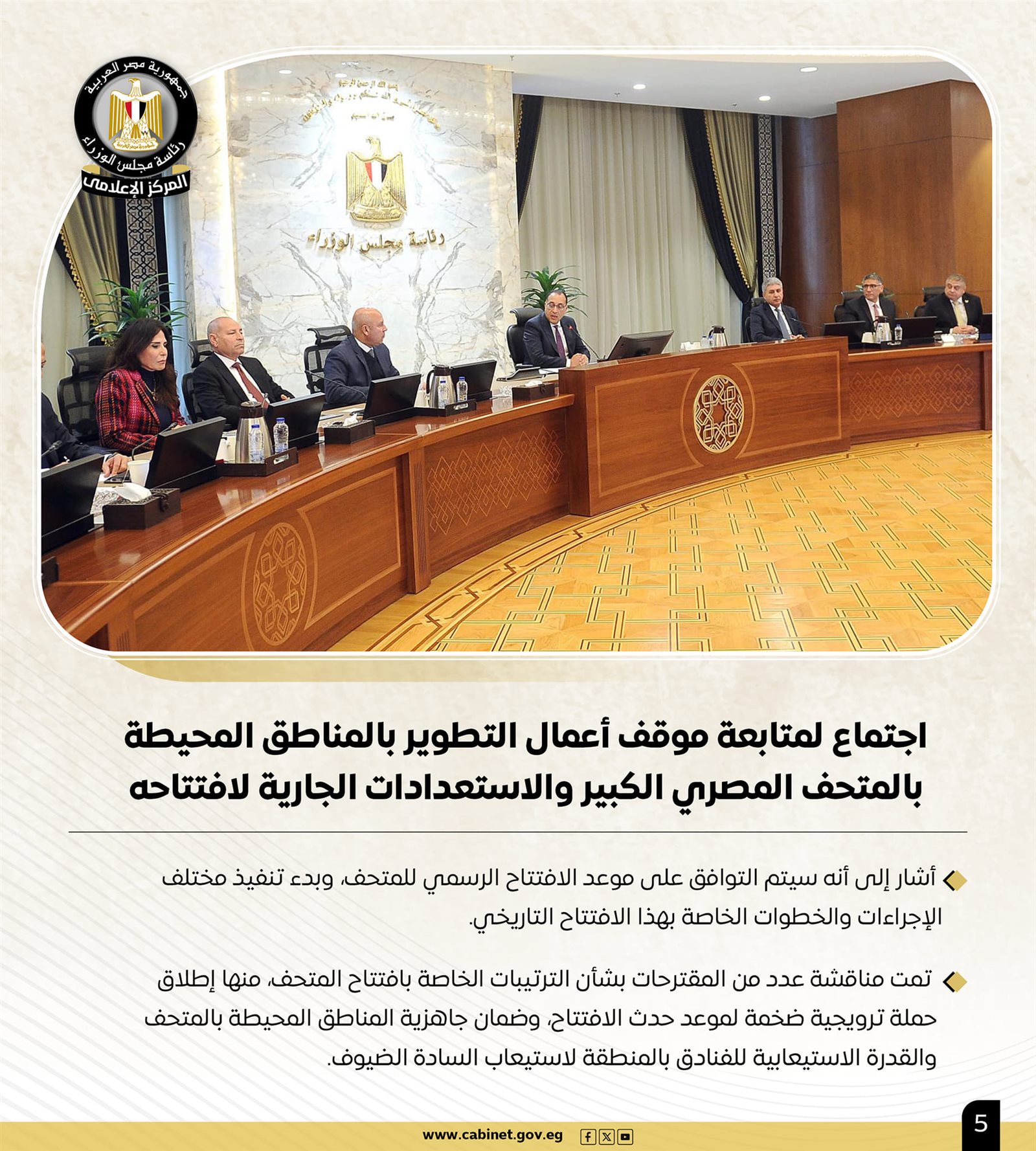 وإلى جانب ما سبق، فقد عقد الدكتور مصطفى مدبولي اجتماعًا لمتابعة موقف أعمال التطوير بالمناطق المحيطة بالمتحف المصري الكبير والاستعدادات الجارية لافتتاحه، مشيرًا إلى أنه سيتم التوافق على موعد الافتتاح الرسمي للمتحف، وبدء تنفيذ مختلف الإجراءات والخطوات الخاصة بهذا الافتتاح التاريخي.