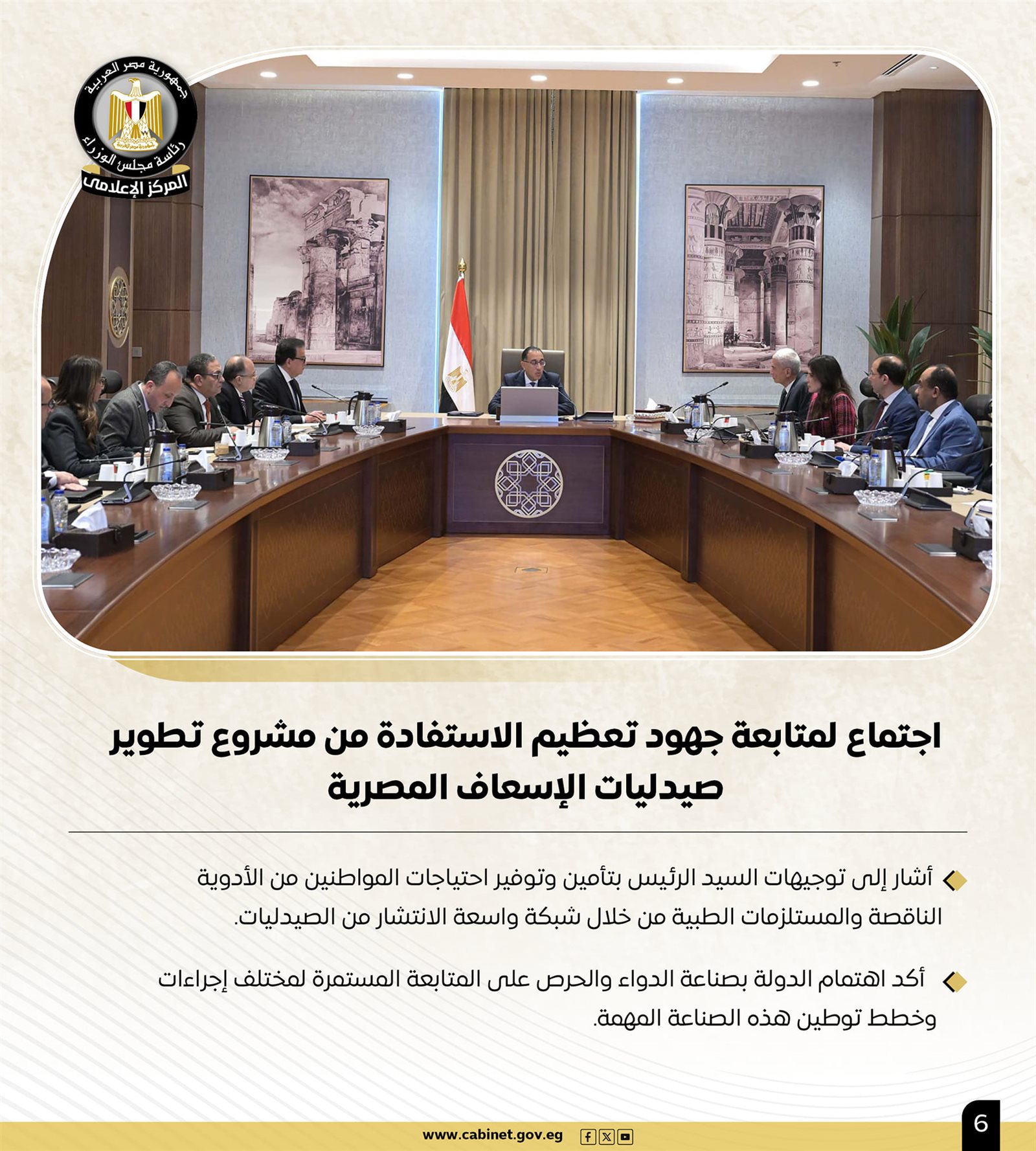 يأتي هذا فيما عقد رئيس مجلس الوزراء اجتماعًا لمتابعة جهود تعظيم الاستفادة من مشروع تطوير صيدليات الإسعاف المصرية، مشيرًا إلى توجيهات السيد الرئيس بتأمين وتوفير احتياجات المواطنين من الأدوية الناقصة والمستلزمات الطبية من خلال شبكة واسعة الانتشار من الصيدليات، كما أكد سيادته اهتمام الدولة بصناعة الدواء والحرص على المتابعة المستمرة لمختلف إجراءات وخطط توطين هذه الصناعة المهمة.