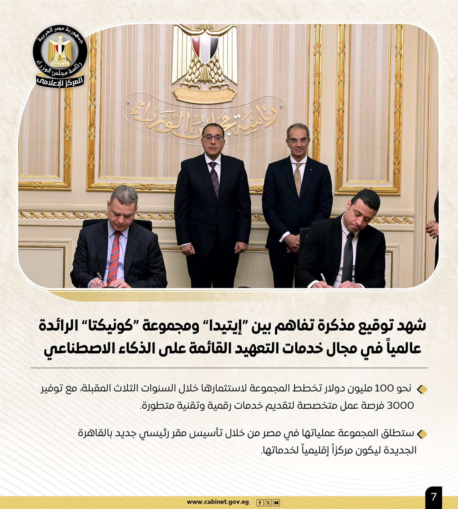 كما شهد الدكتور مصطفى مدبولي خلال الأسبوع الجاري، توقيع مذكرة تفاهم بين "إيتيدا" ومجموعة "كونيكتا" الرائدة عالميًا في مجال خدمات التعهيد القائمة على الذكاء الاصطناعي، علمًا بأن نحو 100 مليون دولار تخطط المجموعة لاستثمارها خلال السنوات الثلاث المقبلة، مع توفير 3000 فرصة عمل متخصصة لتقديم خدمات رقمية وتقنية متطورة.