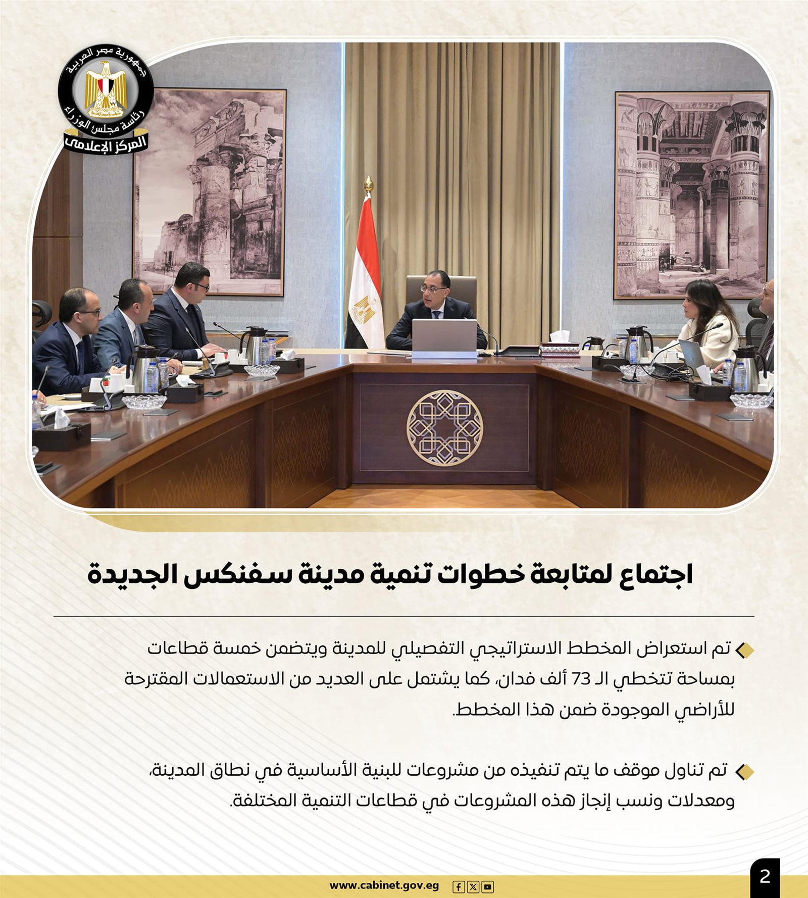 وجاء في التقرير الأسبوعي الصادر عن المركز الإعلامي لمجلس الوزراء أن نشاط الدكتور مصطفى مدبولي شمل عقد اجتماع لمتابعة خطوات تنمية مدينة سفنكس الجديدة، حيث تم استعراض المخطط الاستراتيجي التفصيلي للمدينة ويتضمن خمسة قطاعات بمساحة تتخطى الـ 73 ألف فدان، كما يشتمل على العديد من الاستعمالات المقترحة للأراضي الموجودة ضمن هذا المخطط، وتناول الاجتماع أيضًا موقف ما يتم تنفيذه من مشروعات للبنية الأساسية في نطاق المدينة، ومعدلات ونسب إنجاز هذه المشروعات في قطاعات التنمية المختلفة.