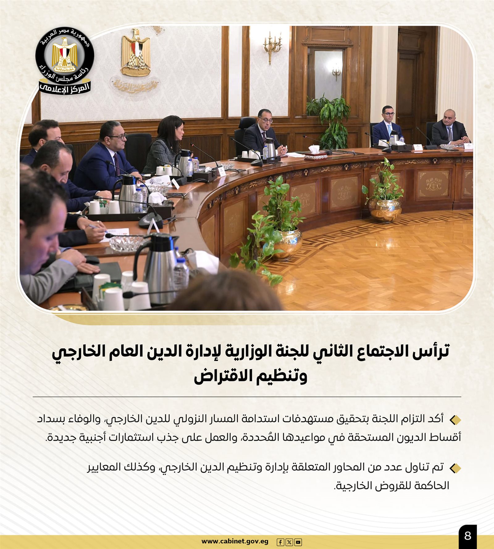وأخيرًا، ترأس الدكتور مصطفى مدبولي الاجتماع الثاني للجنة الوزارية لإدارة الدين العام الخارجي وتنظيم الاقتراض، وقد أكد سيادته التزام اللجنة بتحقيق مستهدفات استدامة المسار النزولي للدين الخارجي، والوفاء بسداد أقساط الديون المستحقة في مواعيدها المُحددة، والعمل على جذب استثمارات أجنبية جديدة، كما تم تناول عدد من المحاور المتعلقة بإدارة وتنظيم الدين الخارجي، وكذلك المعايير الحاكمة للقروض الخارجية.