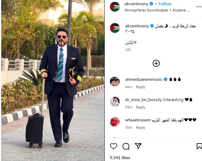ونشر أكرم فيديو عبر صفحته الرسمية "إنستجرام" مرتديًا بدلة كابتن طيار وعلق عليه " ميعاد الرحلة قرب .. رمضان ٢٠٢٥".