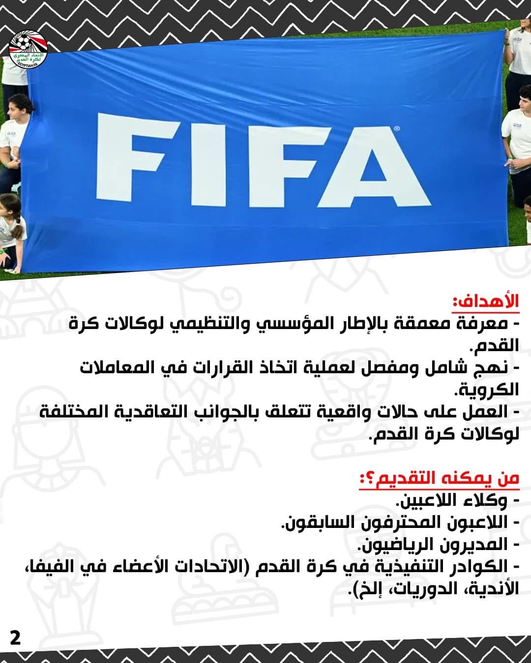 أعلن اتحاد الكرة المصري عن النسخة الثانية من برنامج الاتحاد الدولي لكرة القدم " فيفا " بشأن العمل فى مجال وكالة لاعبى كرة القدم وهو برنامج متكامل يستعرض كيفية العمل فى مجال وكالة اللاعبين ومتطلباتها وكذلك الطبيعة القانونية لعقود لاعبي كرة القدم المحترفين ومنح تراخيص وكلاء اللاعبين من الاتحادات الوطنية لكرة القدم وكيفية تقنين وضع اللاعبين وقواعد انتقالهم.