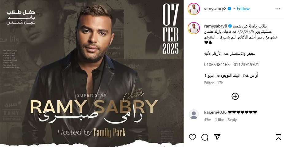 ونشر صبري البوستر الدعائي للحفل عبر صفحته الرسمية "إنستجرام" وعلق علية " طلاب جامعة عين شمس مستنيكم يوم 7/2/2025 في فاميلي بارك عشان نغني مع بعض أحلى الأغاني اللي بتحبوها .. استنوني ".