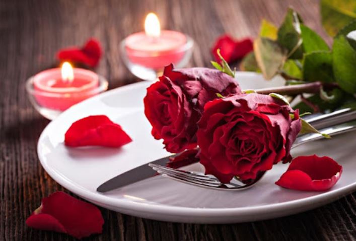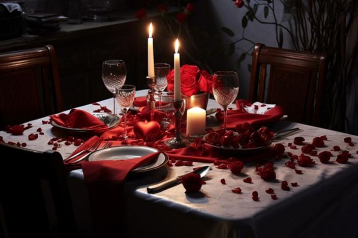 تزيين طاولة العشاء بألوان الحب مثل الأحمر والوردي.