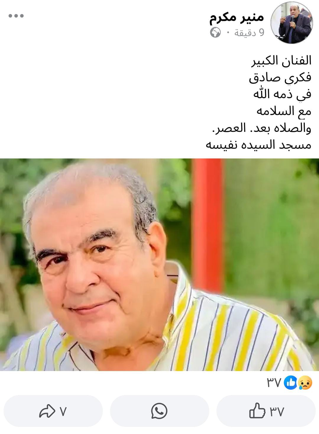 وفاة الفنان فكري صادق وهذا موعد الجنازة