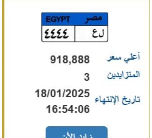 كما تم طرح، لوحة ب و ص - 3333، أعلى سعر: 310 ألف جنيه عدد المتزايدين: 5 أفراد، تاريخ انتهاء المزاد: 19 يناير، كما تم طرح، لوحة ن ج م – 9991، أعلى سعر: 200 ألف جنيه، عدد المزايدين: 3 أفراد، تاريخ انتهاء المزاد 19 يناير.