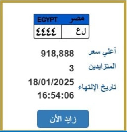 وفي السطور التالية نستعرض تفاصيل اللوحات المعدنية المميزة التي تم طرحها، حيث جاءت أول لوحة ل ع - 4444، أعلى سعر:918 ألف جنيه،عدد المزايدين: 3 أفراد تاريخ انتهاء المزاد: 18 يناير.
