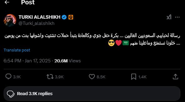 وكتب تركي آل شيخ عبر منصة "إكس" تويتر سابقآ " رسالة لحبايبي السعوديين الغاليين … بكرة حفل جوي وكالعادة بتبدأ حملات تشتيت واشوفها بدأت من يومين … خلونا نستمتع وماعلينا منهم".