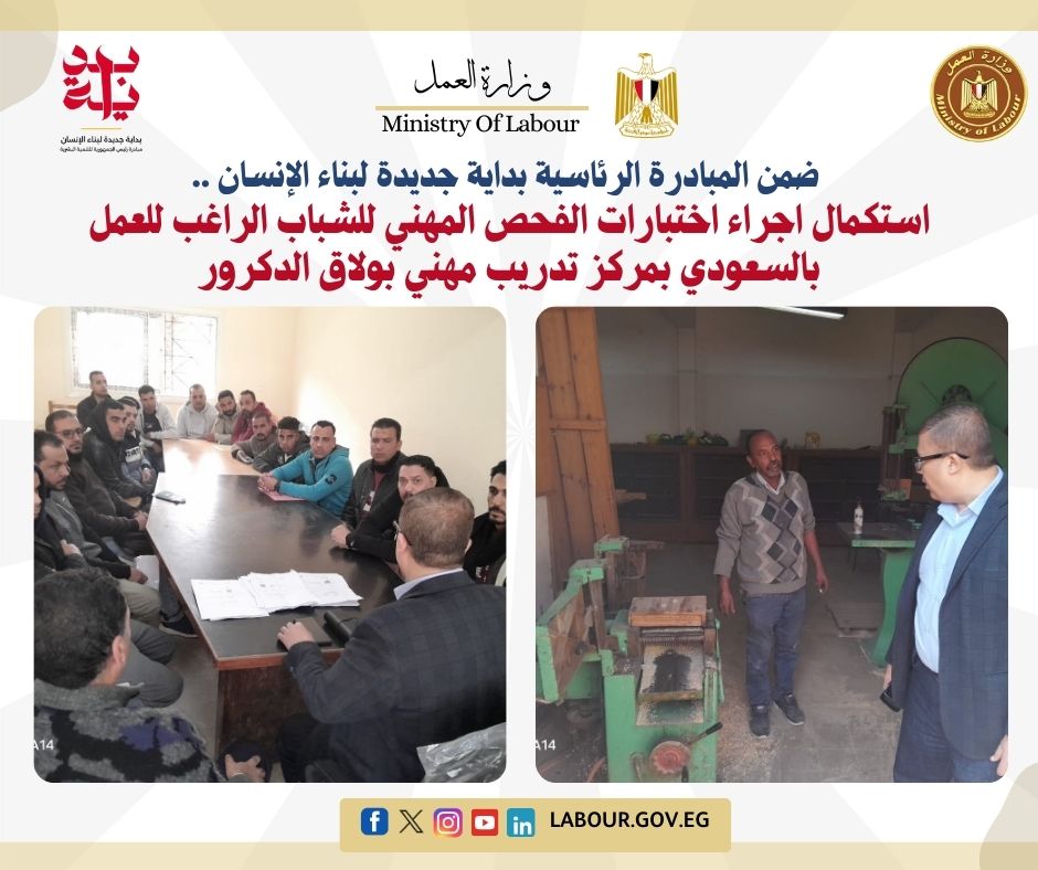 إستكمالا لتنفيذ توجيهات القيادة السياسية بالإستثمار في العنصر البشري وتنمية مهاراته وقدراته لتواكب سوق العمل بالداخل والخارج وفي إطار تنفيذ إتفاقية تشغيل برنامج الفحص المهني والمبرمة بين وزارة العمل ووزارة الموارد البشرية والتنمية الإجتماعية بالمملكة العربية السعودية بهدف تلبية إحتياجات سوق العمل السعودي من القوي العاملة المصرية الماهرة، وتحت رعاية وزير العمل محمد جبران، أعلن محمد رمضان مدير مديرية العمل بالجيزة أن المديرية استكلمت عملية الفحص المهني بمركز تدريب مهني بولاق الدكرور لبعض المهن المطلوبة بالمملكة العربية السعودية لمهنة أعمال الكهرباء والسباكة وصيانة الأجهزة الكهربية والمباني وميكانيكا السيارات بمشاركة : محمد الكيلاني، وماجد علي، وصالح السيد، وأمينة سعيد، و وفاء سمير، وقد تابع محمد رمضان مدير المديرية سير العمل والإختبارات بالزيارات الميدانية المفاجئة لمركز بولاق الدكرور
