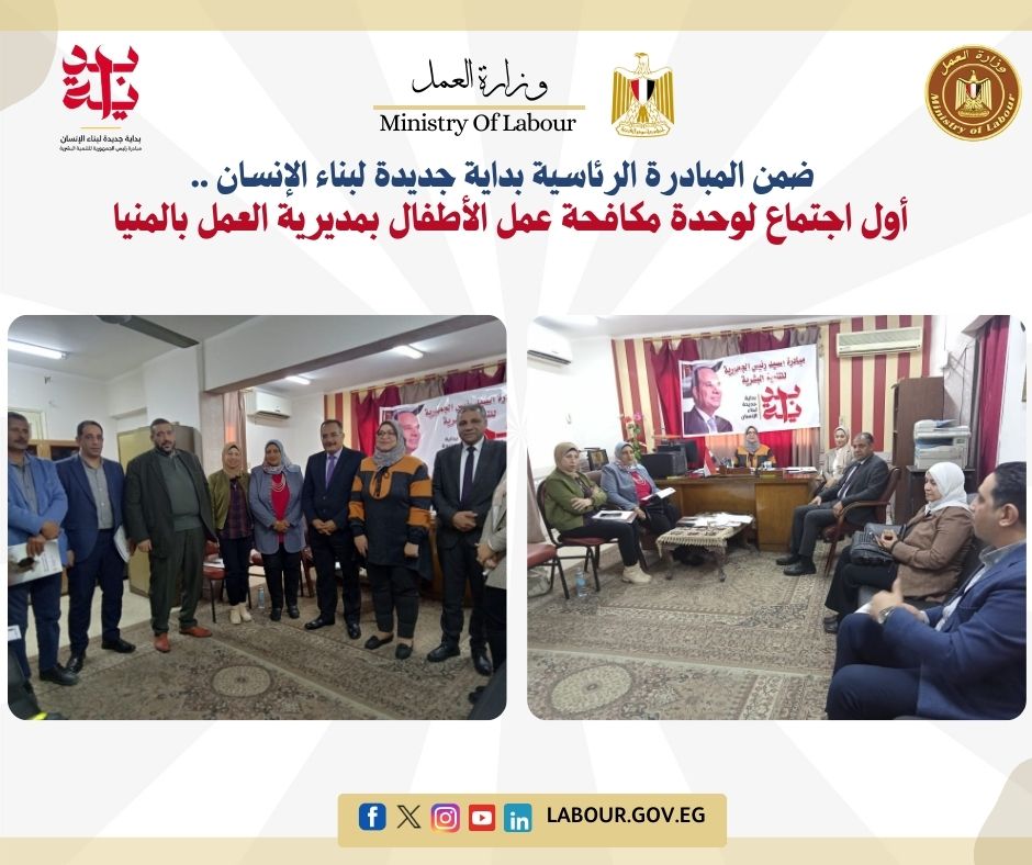 عقدت مديرية العمل بالمنيا أول اجتماع لوحدة مكافحة عمل الاطفال بالمديرية برئاسة الدكتورة ماجدة صلاح - مدير مديرية العمل بالمنيا وتحت اشراف هبه صلاح- مدير إدارة شئون المراة والطفل بالمديرية، وأكدت مدير المديرية على أهمية التنسيق مع الجهات الأخرى.. وقد حضر الاجتماع وكيل وزارة التضامن الاجتماعى بالمنيا ومدير الإدارة العامة لحماية الطفل بديوان عام المحافظة وممثل المجلس القومى للأمومة والطفولة ومديري إدارات تفتيش العمل والسلامة والصحة المهنية والتدرج المهنى.. وتم عرض قرار وزير العمل رقم ٢٣٠ لسنة ٢٠٢٤م، والقرار الصادر من المديرية بالتشكيل للوحدة وأعمال الوحدة والاستماع إلى المقترحات والتوصيات وإعداد خطط العمل الفترة القادمة.