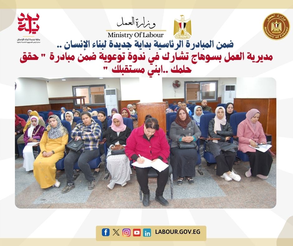 شاركت مديرية العمل بسوهاج بالتنسيق مع وحدة السكان بديوان عام محافظة سوهاج، وبنك مصر وجمعية صناع الخير ومديرية التضامن الاجتماعي، ومديرية الشباب والرياضة، ووحدة السكان بمركز ومدينة أخميم في ندوة توعوية ضمن مبادرة "حقق حلمك ابنى مستقبلك" الموجهة لجميع فئات المجتمع من 18 الى 65 عام ضمن اعمال اللجان السكانية هيث تضمنت الندوة مناقشة عدة موضوعات منها (الشمول المالى – ريادة الاعمال – حاضنات الاعمال )، وذلك بالوحدة المحلية لمركز أخميم .