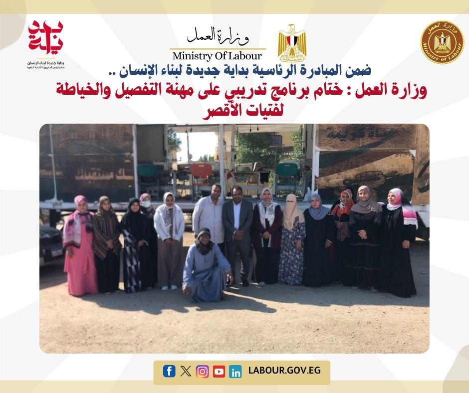 تلقت وزارة العمل تقريراً من مديرية العمل بمحافظة الأقصر بشأن ختام الدورة التدريبية المجانية لعدد 10 متدربات على مهنة التفصيل والخياطة، بواقع 150 ساعة تدريبية، وذلك بوحدة التدريب المتنقلة، في إطار المبادرة الرئاسية بداية جديدة لبناء الإنسان ومبادرة حياة كريمة في القرى الأكثر احتياجاً،و مبادرة مهنتك مستقبلك لتدريب الشباب، وتنفيذاً لتوجيهات وزير العمل محمد جبران بتدريب الشباب من الجنسين على المهن المطلوبة في سوق العمل بالمحافظات للارتقاء بالمستوى الاجتماعي والاقتصادي للمواطنين المستهدفين، وتوفير فرص عمل للمواطنين والاستثمار في تنمية الشباب المصري.