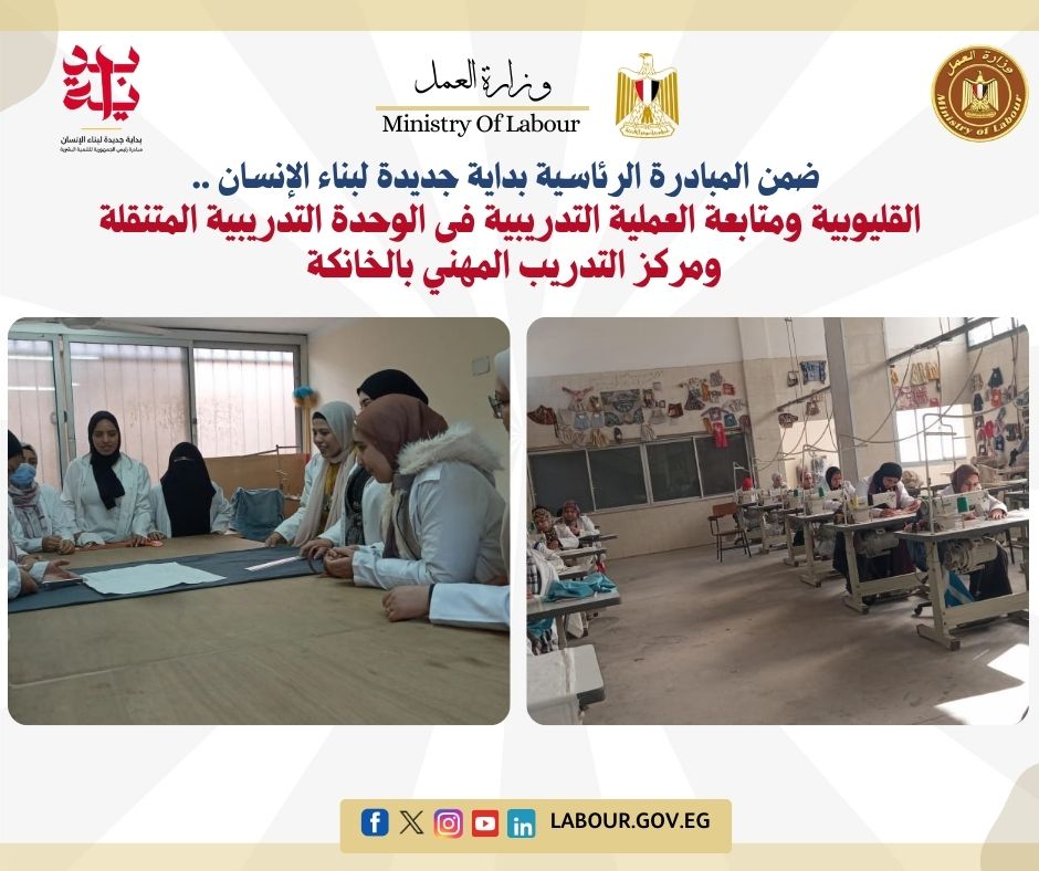 تنفيذاً لتوجيهات وزير العمل محمد جبران " ،وأيمن عطية محافظ القليوبية، بالمتابعة الدورية لكافة أعمال المديرية المنفذة لضمان الجودة والوصول لأعلى درجات الإنجاز، شهدت مديرية العمل بالقليوبية متابعة تدريب دفعات جديدة للتدريب والتأهيل لسوق العمل داخل نطاق محافظة القليوبية ، على مهنة "التفصيل والحياكة" وذلك بمركز التدريب المهني بالخانكة ، والوحدة المتنقلة بقرية منية شبين القناطر،ط..أكد فوزي صابر وكيل المديرية في تقريره للوزارة أن البرامج التدريبية جاءت وفق نظام الساعات التدريبية المعتمدة بوزارة العمل بموجب 150 ساعة تدريبية ، تحت إشراف "الإدارة المركزية للتدريب المهني بوزارة العمل "، و " إدارة التدريب المهني بالمديرية"