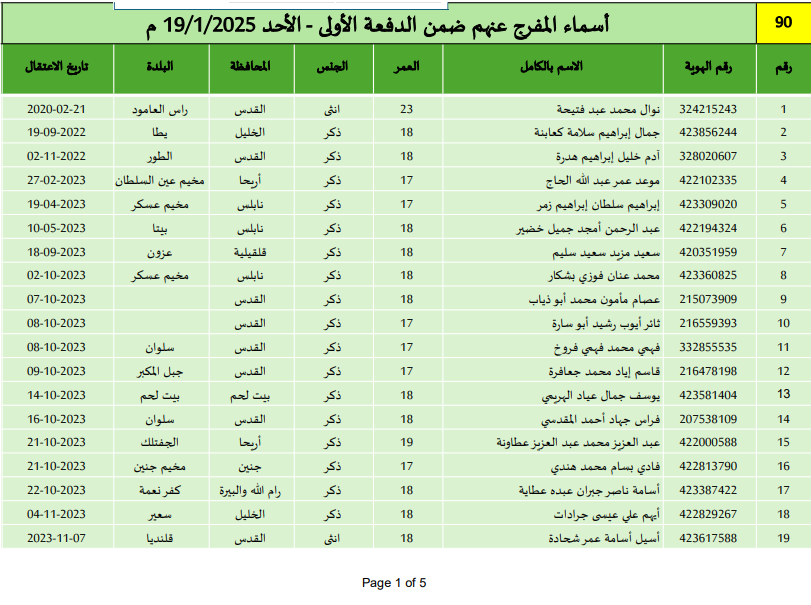 أعلن مكتب الشهداء والأسرى في حماس، وهيئة شؤون الأسرى والمحررين القائمة الأولى من أسماء الأسرى المحررين في المرحلة الأولى لعملية التبادل لليوم الموافق 19/1/2025