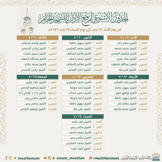 جدول أئمة الحرم المكي هذا الأسبوع 1446… كشفت إدارة شؤون الأئمة والمؤذنين في الحرم المكي، عبر حسابها الرسمي على منصة “إكس” (تويتر سابقًا)، عن جدول أئمة الحرم المكي لهذا الأسبوع، والذي يمتد من يوم الأحد 19 رجب وحتى يوم السبت 25 رجب 1446هـ، يحظى هذا الجدول باهتمام واسع من المسلمين في جميع أنحاء العالم، لما يمثله الحرم المكي من قدسية خاصة كأعظم وأقدس بقاع الأرض.