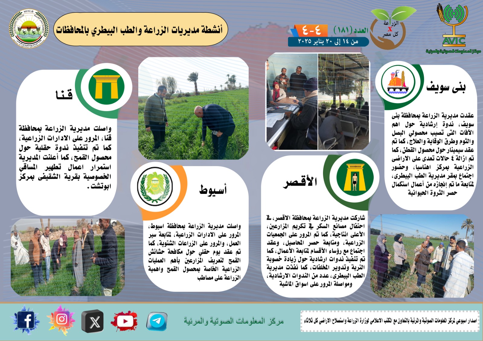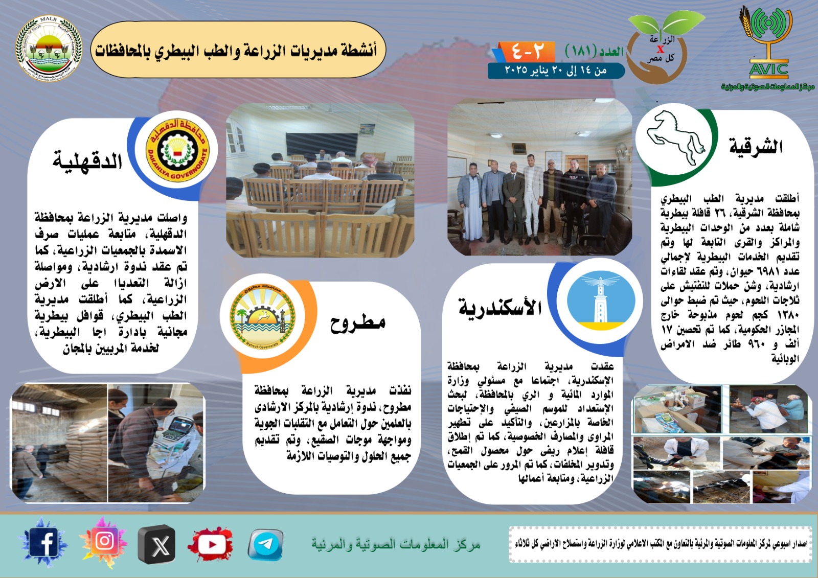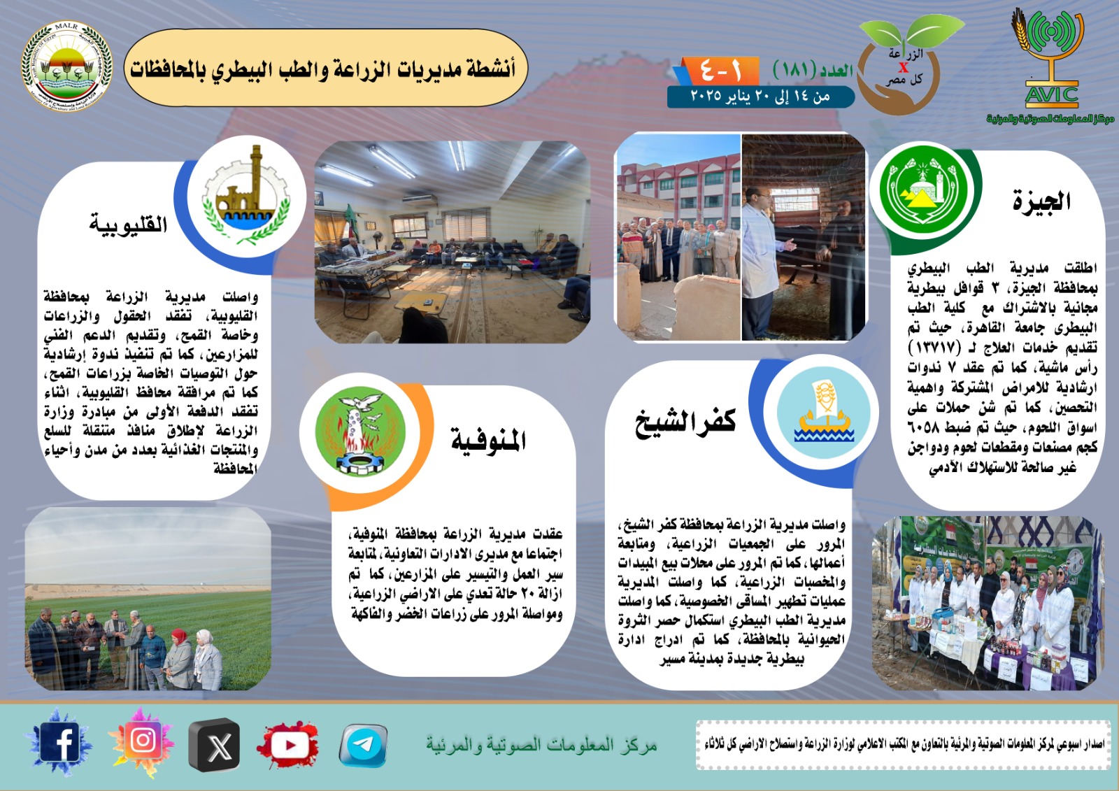 أصدر مركز المعلومات الصوتية والمرئية التابع لوزارة الزراعة واستصلاح الأراضي، والمكتب الاعلامي للوزارة، العدد رقم 181 من اصدار: "الزراعة في كل مصر" بالانجراف والفيديو، يوضح الجهود والانشطة التي تقوم بها مديريات الزراعة والطب البيطري بمحافظات الجمهورية خلال الفترة من 14 يناير إلى 20 يناير الجاري.