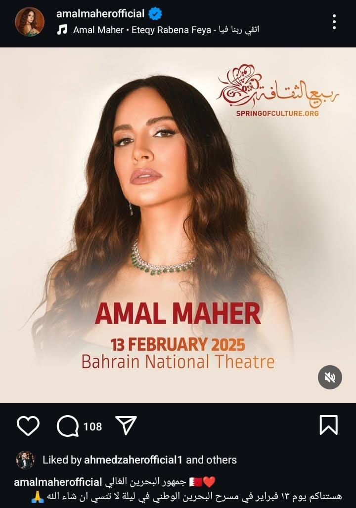 وكشفت آمال ماهر عن موعد الحفل في البحرين من خلال منشور عبر حسابها الرسمي علي موقع تبادل الصور والفديوهات القصيرة “إنستجرام” معلقا: “ جمهور البحرين الغالي هستناكم في 13 فبراير في مسرح البحرين الوطني في ليلة لا تنسي ان شاء الله”.