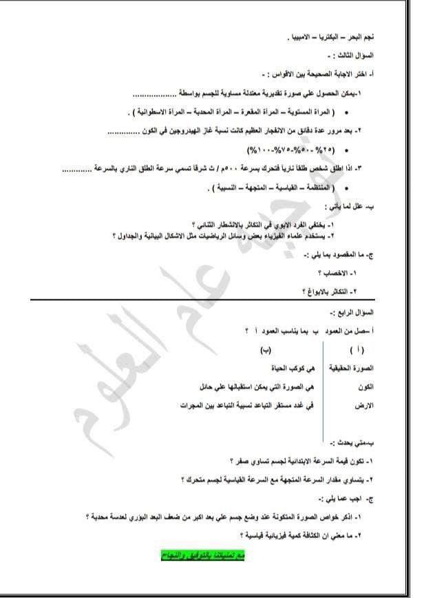 نموذج حل امتحان العلوم الصف الثالث الاعدادي 2025