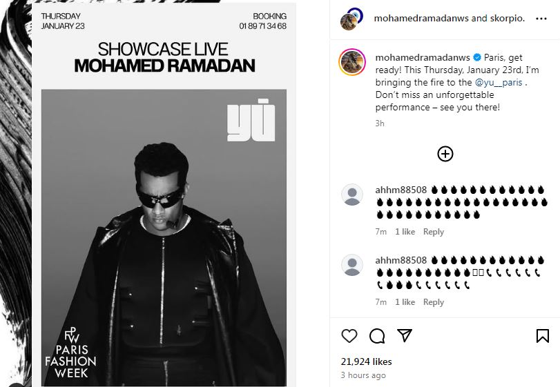 ونشر رمضان البوستر الدعائي للحفل وعلق عليه " باريس، استعدي! في يوم الخميس الموافق 23 يناير، سأحضر عرضًا رائعًا لا تفوتي عرضًا لا يُنسى - نراك هناك!".