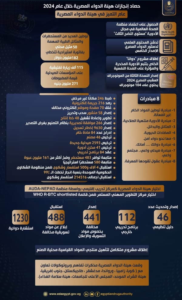 فيما قامت الهيئة بإتاحة النشرات الطبية لمستحضرات الأدوية البشرية المسجلة على موقع هيئة الدواء المصرية؛ ليبلغ إجمالي ما تم اتاحته من نشرات الكترونية أكثر من 94% من إجمالي عدد المستحضرات المسجلة، وإصدار 441 مخالفة بخصوص مواد التسويق والإعلان المتداولة بسوق الدواء خلال العام الماضى، واستقبال 488 إبلاغ عن مواد تسويقية مخالفة أو غير ملائمة، من أجل ضمان وصول المعلومات الصحيحة والموثوقة والمحدثة والمحايدة وغير المُضَلِلَة للمواطنين بشكل مقبول ومناسب لجميع فئات المجتمع، وأيضا الاستجابة للاستفسارات الدوائية للمواطنين ومقدمي الرعاية الصحية من خلال خدمة الاستفسار عن أي معلومات تتعلق بالأدوية والمستحضرات الصيدلية والاستخدام الأمثل لها حيث بلغ إجمالي عدد الاستشارات 1230 استشارة، وذلك بهدف توفير معلومات دقيقة وموضوعية حول الأدوية بناءً على الأدلة العلمية المحدثة، ونشر الوعي المجتمعي حول الاستخدام الآمن للأدوية، تثقيف كل من المرضى ومقدمي الرعاية الصحية لضمان الاستخدام الأمثل للأدوية، وفي هذا الصدد، أطلقت الهيئة مبادرة الرعاية الصيدلية -اليقظة الصيدلية (معا نحو دواء آمن)، ومبادرة دوائك .... أمانك، ومبادرة صيدلي واعي.. مجتمع واعي، ومبادرة الرعاية الصيدلية - عقول تقودها المعرفة.