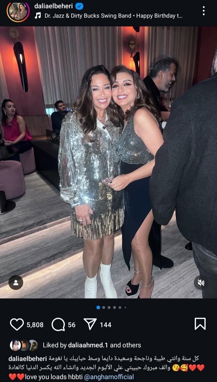 حرصت الفنانة داليا البحيري علي تهنئة صديقتها أنغام بعيد ميلادها الـ 53، ونشرت داليا البحيري من خلال حسابها الرسمي علي موقع تبادل الصور والفديوهات القصيرة "إنستجرام" صور من خلال حفل أمس مع عدد من النجوم معلقا: “ كل سنة وأنتي طيبة وناجحة وسعيدة دايما وسط حبايبك يا نغومة، والف مبروك حبيبتي علي الالبوم الجديد وان شاء الله يكسر الدنيا كالعادة، بحبك جدًا يا حبيبتي”.