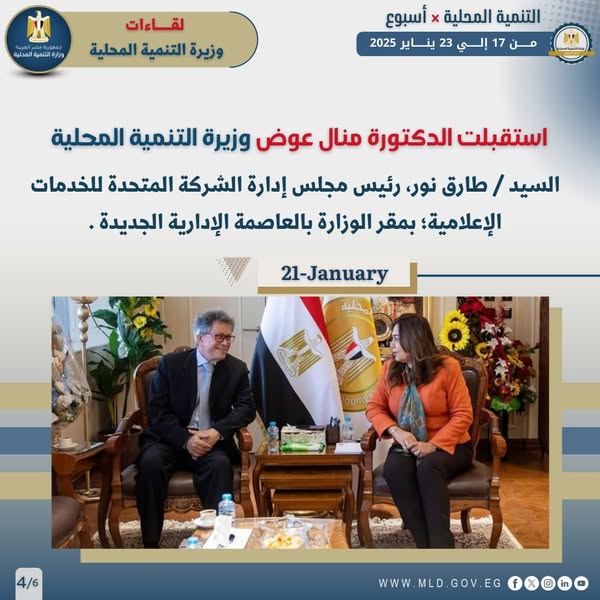 استقبلت الدكتورة منال عوض وزيرة التنمية المحلية، السيد / طارق نور، رئيس مجلس إدارة الشركة المتحدة للخدمات الإعلامية؛ بمقر الوزارة بالعاصمة الإدارية الجديدة، وأشادت وزيرة التنمية المحلية بالدور المهم الذى تقوم به الشركة المتحدة والتي أصبحت أحد ركائز صناعة قوة مصر الناعمة ومنظومة الإعلام المصري، مشيدة بالدور الكبير الذى تقوم به الشركة المتحدة في تسليط الضوء على جهود الدولة التنموية في مختلف المجالات على أرض محافظات الجمهورية.