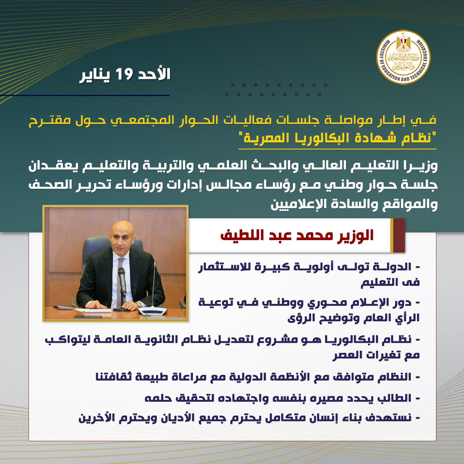 تواصلت فعاليات الحوار المجتمعي الذي تنظمه وزارة التربية والتعليم والتعليم الفنى ووزارة التعليم العالي والبحث العلمي؛ حول مقترح نظام "شهادة البكالوريا المصرية"، وذلك بجلسة حوار وطنى عقدها الدكتور أيمن عاشور وزير التعليم العالي والبحث العلمي، والسيد محمد عبد اللطيف وزير التربية والتعليم الفنى، مع رؤساء مجالس إدارات ورؤساء تحرير الصحف والمواقع والسادة الإعلاميين؛ لمناقشة ملامح هذا النظام واستعراض المقترحات والآراء حوله.