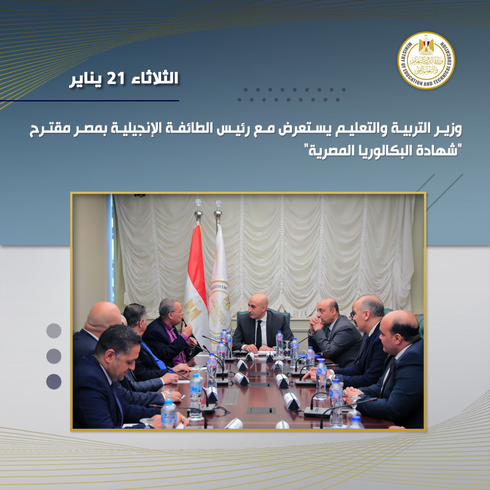 استقبل السيد/ محمد عبد اللطيف وزير التربية والتعليم والتعليم الفني، الدكتور القس أندريه زكي، رئيس الطائفة الإنجيلية في مصر، والوفد المرافق له؛ لاستعراض مقترح "نظام البكالوريا المصرية".