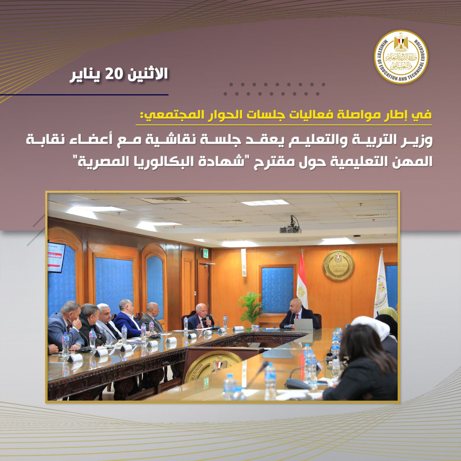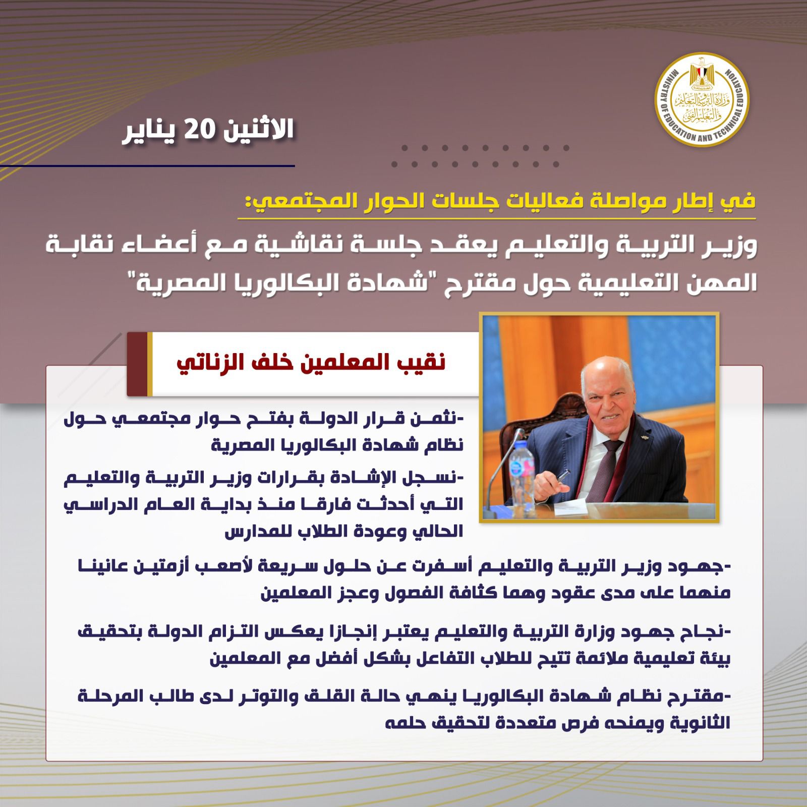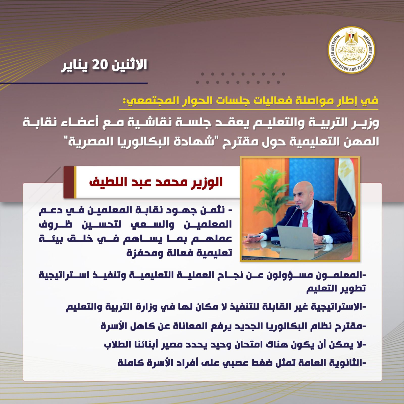 عقد السيد محمد عبد اللطيف وزير التربية والتعليم والتعليم الفني، لقاءً مع أعضاء النقابة العامة للمهن التعليمية، بحضور الأستاذ خلف الزناتي نقيب المعلمين ورئيس اتحاد المعلمين العرب؛ وذلك في إطار جلسات الحوار المجتمعي حول مقترح "نظام شهادة البكالوريا المصرية" لمناقشة ملامح النظام واستعراض الآراء والمقترحات المتعلقة به.
