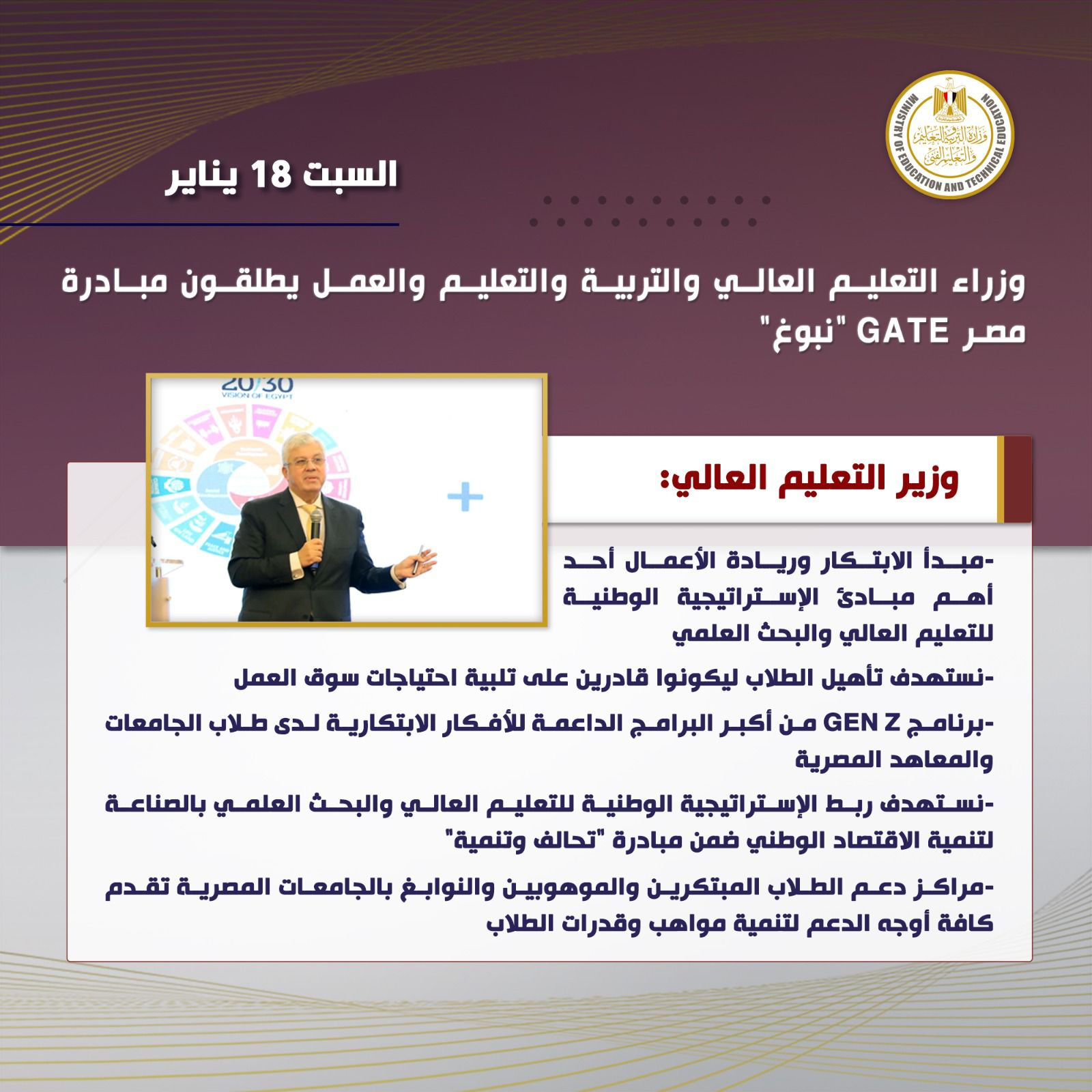 أطلق الدكتور أيمن عاشور وزير التعليم العالي والبحث العلمي ومحمد عبداللطيف وزير التربية والتعليم والتعليم الفني، و محمد جبران وزير العمل، مبادرة (مصر GATE "نبوغ")، بحضور الدكتورة جينا الفقي القائم بأعمال رئيس أكاديمية البحث العلمي والتكنولوجيا، والدكتور هاني عياد المدير التنفيذي لصندوق رعاية المبتكرين والنوابغ.