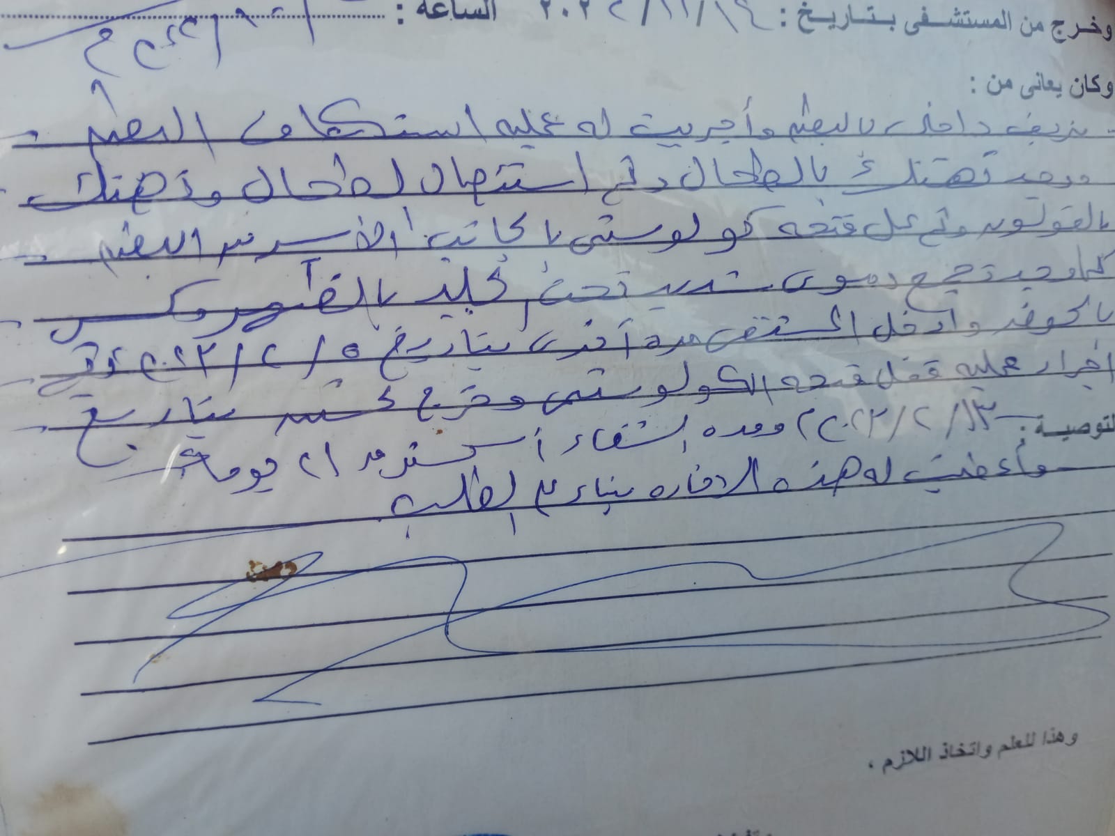 متابعا: “حصلت علي جميع التقارير الطبية من المستشفى التي تثبت استئصال الطحال وجزء من الأمعاء وتأكيد أن باقي الأعضاء الداخلية سليمه، باستثناء القولون تم عمل فتحه خارجية للتبرز لحين اجراء عملية جراحية أخرى، وبالفعل قام نفس الطبيب بعد 4 شهور بإجراء عملية ثانية وإعادة القولون لمكانه الطبيعي داخل الجسد، وكان ذلك تحديدا يوم 5 مارس 2023”.