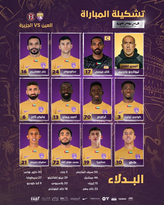 الننى أساسي.. تشكيل الجزيرة أمام العين في ربع نهائي كأس رئيس الإمارات