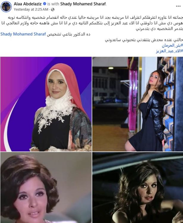 وكتبت آلاء عبد العزيز منشورًا عبر حسابها على موقع التواصل الاجتماعي “فيسبوك” تتحدث خلاله عن معاناتها مع مرض الانفصام في الشخصية.
