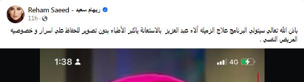 ونشرت ريهام سعيد عبر حسابها الرسمي علي فيسبوك، قائلة: "بإذن الله تعالى سيتولى البرنامج علاج الزميلة آلاء عبد العزيز بالاستعانة بأكبر الأطباء بدون تصوير للحفاظ على أسرار وخصوصية المريض النفسي".