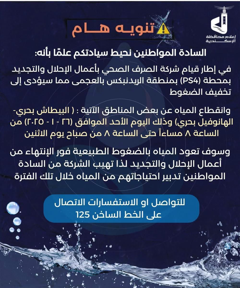أعلنت محافظة الإسكندرية عن تخفيف الضغوط وإنقطاع المياه عن بعض المناطق الأتية: (البيطاش بحري-الهانوفيل بحري) اليوم من الساعة ٨ مساءاً حتى الساعة ٨ من صباح غدا الاثنين الموافق ٢٧-١-٢٠٢٥.